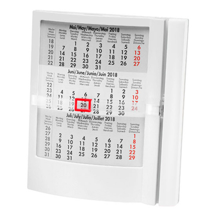 Tischkalender. 1- oder 2-farbiges Gehäuse, inkl. 3-Monatskalender, gültig für 2 Jahre, 4-sprachig D, GB, F, E. Farbkombinationen möglich.